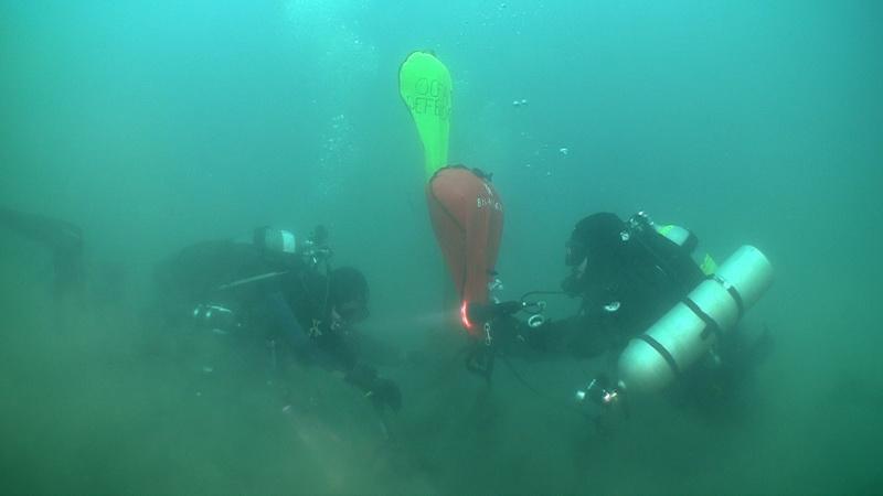 We open the valves on the two scuba cylinders that inflate the bags. Swim clear as the bags lift and carry the container towards the surface.