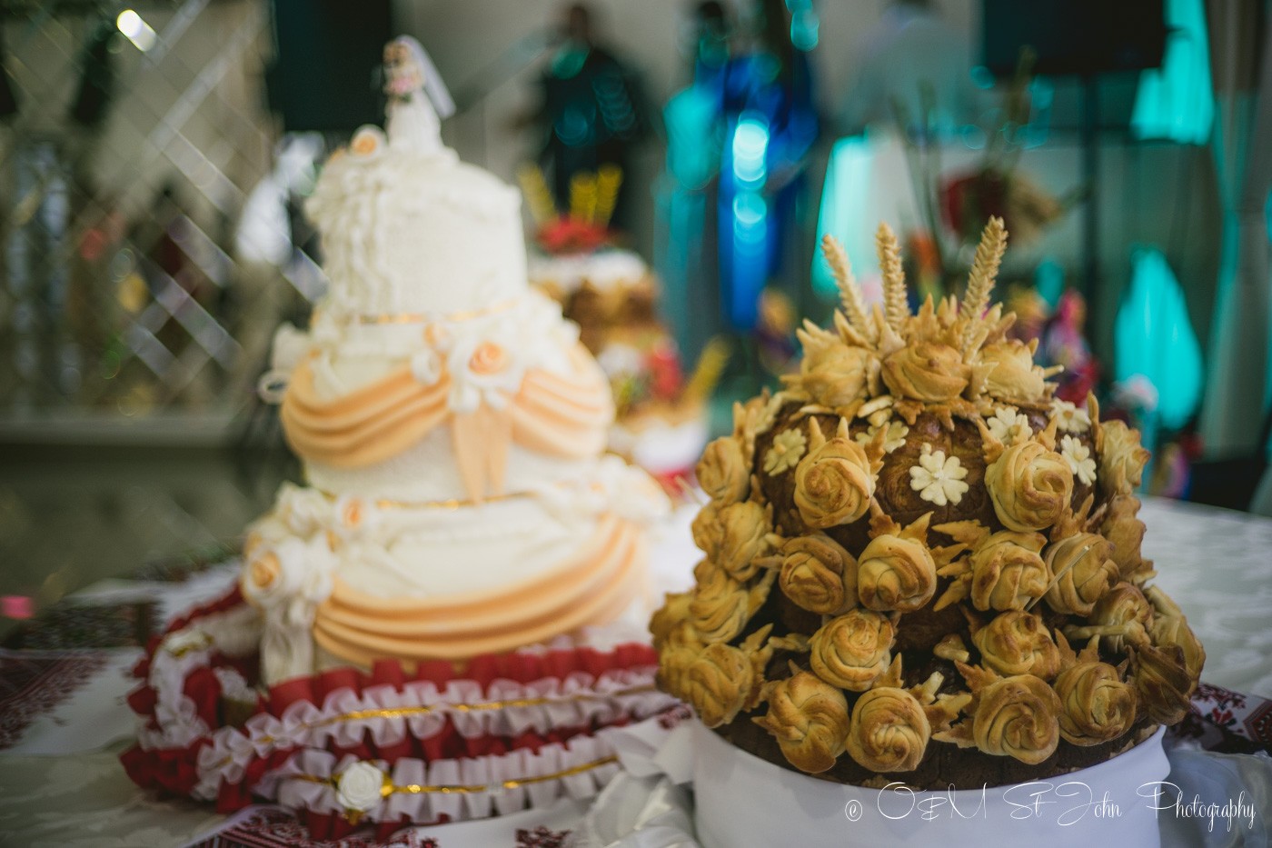 After refilling glasses, Mariyka Shevchuk and Sergei Kovalyov disappeared, returning with a large five-tiered Ukrainian wedding cake. They placed it on an embroidered tablecloth, raised above the other delicacies already being devoured, and beside the Western-style cake.