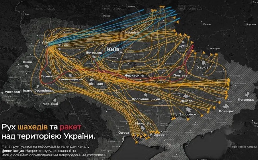 The map shows the number of combat drones over Ukraine overnight Wednesday, July 9. Image: Ukrainian Intelligence Telegram channel.